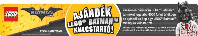 Mindezek mellett most ajándékot is tartogatunk a számotokra, ha 6000 Ft felett vásároltok LEGO Batman termékeket. A 6000 Ft feletti vásárlások mellé rendszerünk egy ajándék LEGO Batman kulcstartót tesz hozzá!