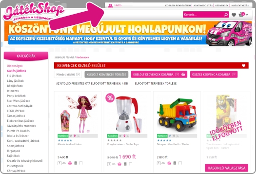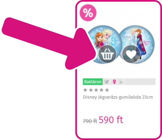 TERMÉKDOBOZOK: A termékdobozokon továbbra is sok lényeges információt megtalálsz a termékekről anélkül, hogy rá kellene kattintanod. Ilyenek mindenek előtt az ajánlott életkor, az ajánlott nem valamint a raktárkészlet. ÚJDONSÁG, hogy, ha a termékdobozokra ráviszed az egeret, akkor az aktuális terméket azonnal berakhatod a kosaradba vagy a kedvencek közé a megjelenő kis szürke ikonokkal.